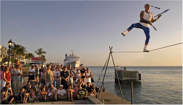 A nightly arts festival on Mallory Square features arts, crafts, street performers, psychics and food carts. The performers appearing nightly include jugglers, escape artists, musicians, magicians, tight rope walkers and other colorful acts. (D)